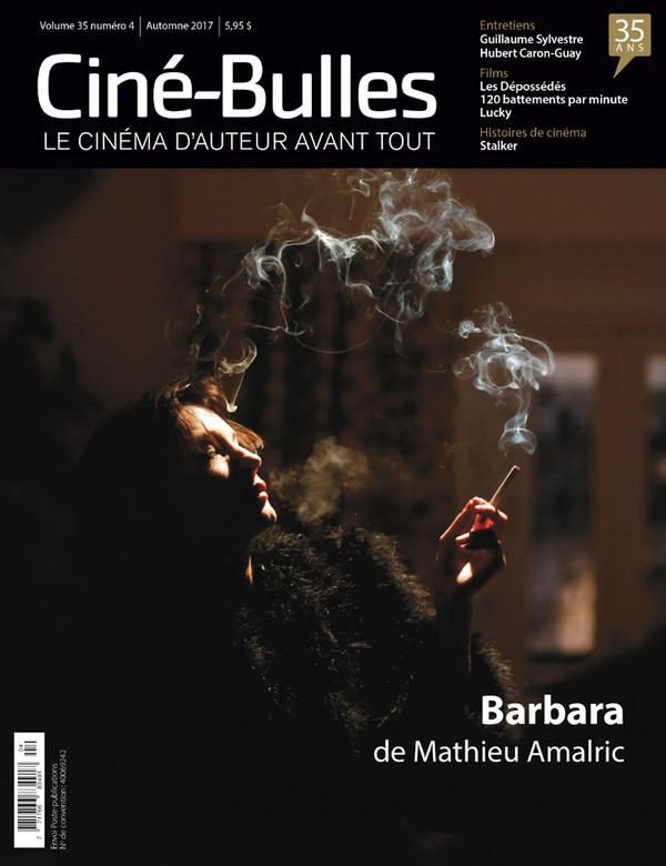 «Ce numéro propose une foule d’exclusivités. D’abord, trois entretiens : Mathieu Amalric (pour le sublime Barbara avec Jeanne Balibar, sujet de la page couverture), Guillaume Sylvestre (pour l’émouvant DPJ) et Hubert Caron-Guay (pour le très actuel Destierros). Puis, des textes sur les films Les dépossédés de Mathieu Roy, Lucky de John Caroll Lynch et Nothingwood de Sonia Kronlund. Également dans ce numéro, Stalker d’Andreï Tarkovski (Histoires de cinéma)».