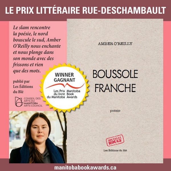 Poète, slameuse et auteure de théâtre multilingue originaire de Yellowknife, Amber O’Reilly remporte le Prix littéraire Rue-Deschambault 2021 pour son recueil Boussole franche publié aux éditions du Blé (Saint-Boniface).