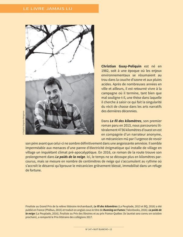 Après avoir été récompensé par le Prix littéraire des collégiens en avril dernier, Le poids de la neige (paru à La Peuplade) de Christian Guay-Poliquin remporte le Prix littéraire France-Québec 2017.