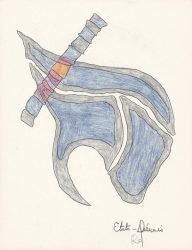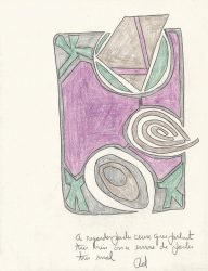 Nous connaissions déjà des collages qui avaient été exposés. Ici les dessins jaillissent d’abondance par l’emploi exclusif de crayons de couleur. Notre étonnement est immédiat, qui vaudrait aussi pour la lecture de ses livres : « Où va-t-il chercher tout ça ? » Le crayon ne permet pas des éclats appuyés, des reliefs frappants mais donne des accords qui ne sont pas simples effets du hasard : gris et rose (fréquent), violet et vert, orange et brun. Pas de flous, de dégradés, de mélanges mais des aplats nettement circonscrits par un trait précis, minutieux, sans remords, qui n’hésite pas et qui projette le dessin vers nous. Les formes semblent surgir spontanément en une invention jamais à court et cependant elles donnent l’impression de savoir où elles vont. Peu de figures humaines, si ce n’est un joueur de hockey et une jeune femme en pied, le plus souvent des masques et des totems, rarement des allusions à du vivant et à de l’organique. Avant tout de l’abstraction. Ces dessins évoquent des graffiti ou, mieux, des tags sur les murs ou des lettres ornées des miniatures médiévales. Association plus hardie : les entrelacs d’une vertigineuse complexité du célèbre livre de Kells irlandais.