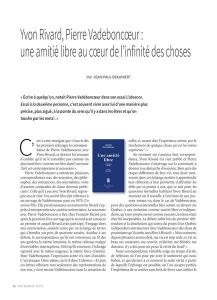 4. Yvon Rivard et Pierre Vadeboncœur, Une amitié libre. Correspondance 1974-2010, Leméac, Montréal, 2022, p. 94.