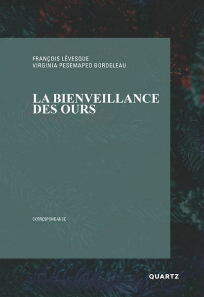 Pour donner le coup d’envoi, La bienveillance des ours réunit donc Lévesque et Bordeleau, que tout semble a priori séparer. Celui-là a la jeune quarantaine, réside à Montréal, est critique de cinéma au Devoir et a, entre autres, publié des polars et des romans fantastiques ; celle-ci a près de trente ans de plus, est d’origine métisse et crie, habite Rouyn-Noranda et s’adonne aux arts visuels, à la poésie et au roman. Géographiques, culturelles, générationnelles, les frontières sont de nature multiple. La rencontre fortuite entre un parapluie et une machine à coudre, dirait Ducasse.